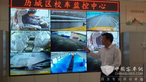 历城区校车办工作人员李化军介绍,每辆校车都在车前、走廊、驾驶座上方、车门安装了4个摄像头。这样工作人员在后台通过屏幕即可实时监控每辆校车的行驶情况,车内有无超员,学生上下车情况等进行远程实时监控。此外,每辆校车都有规定好的线路,一旦车辆偏离规定线路,系统会自动报警,工作人员会及时联系驾驶员纠正。