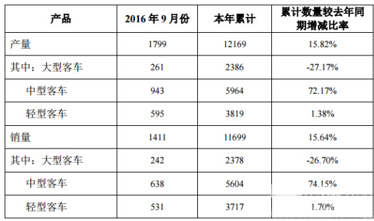 中通2016年9月产销双升,中客销量同比增幅74.15%