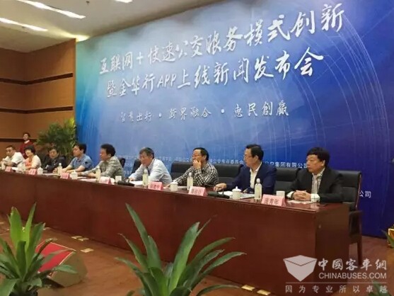 庞青年总裁在新闻发布会上一起为新上线的金华行APP揭牌;郑 健代表青年汽车集团与金华市公交集团、杭州小步科技签订了互联网+BRT流动商业街的战略合作协议。