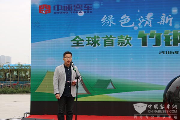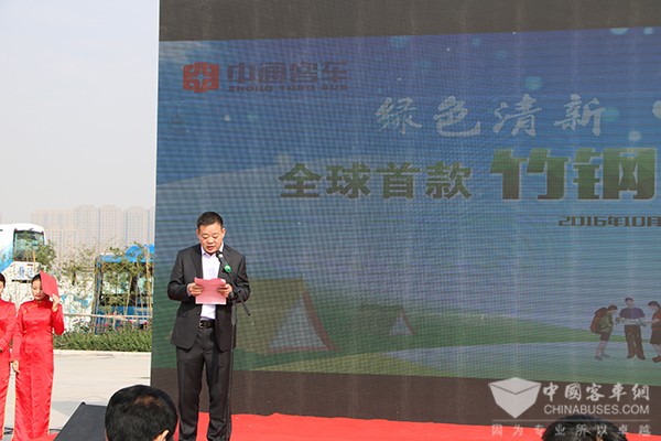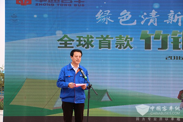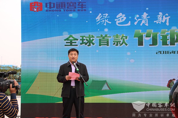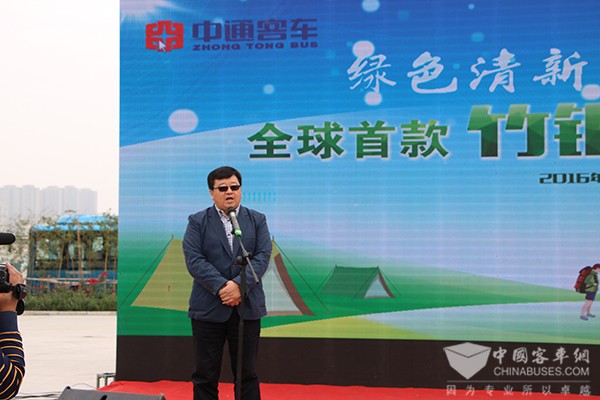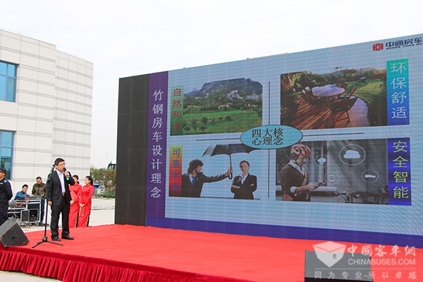 中通客车总经理孙庆民首先致欢迎辞,他表示,该款全球首发的竹钢营地房车是与营地开发企业联手打造的一款外形新颖、天然环保型的全新产品,此次竹钢房车的研发成功,标志着中通在房车领域乃至整个行业都做了一次新技术、新工艺、新材料的突破。