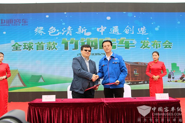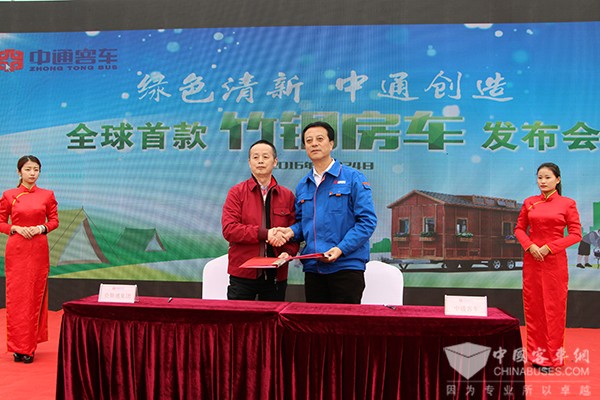 在发布会现场,中通客车与合作伙伴南京雅高公司以及会斯通公司举行了签约仪式,根据协议,两个合作企业将与中通客车一起共同打造面向国内及全球市场的竹钢房车,提升该产品竞争力,实现产业化,在一年内完成超过300台中通竹钢房车的销售。