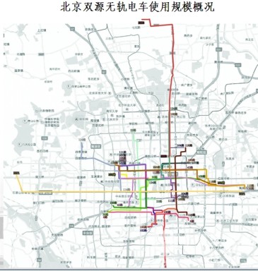 目前北京公交运营的双源无轨电车已达1200辆,担负着2条大容量公交线路和21条普通公交线路的运营,共计23条线路,涉及运营线路里程152.24公里,脱线长度70.4公里。双源无轨电车在搭线行驶时即可充电,其供电系统具有体积小、占地少、建设周期短等特点,大大提高了车辆运营效率。