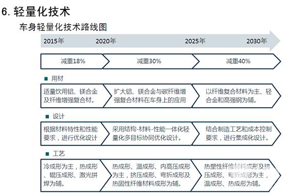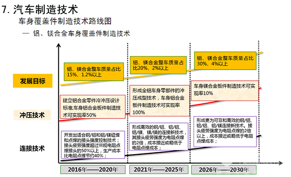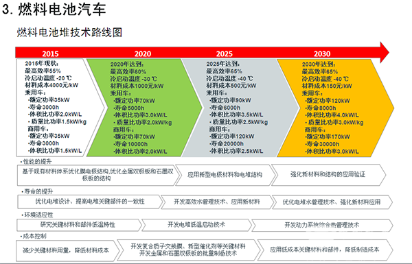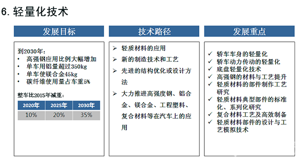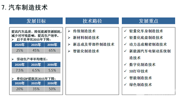 在上述重大目标指引下,路线图进一步凝练关键技术,明晰路径,以新能源汽车和智能网联汽车为主要突破口,以能源动力系统优化升级为重点,以智能化水平提升为主线,以先进制造和轻量化等共性技术为支撑,全面推进汽车产业的低碳化、信息化、智能化和高品质。在此基础上,路线图进一步提出了节能汽车、纯电动和插电式混合动力汽车、氢能燃料电池汽车、智能网联汽车、动力电池、汽车轻量化、汽车制造等七大领域,并分别形成了各自细分领域的技术路线图。