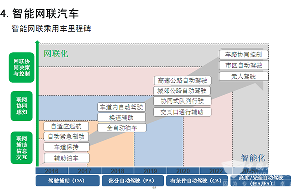 主要里程碑是:至2020年,乘用车新车平均油耗5.0升/百公里,商用车新车油耗接近国际先进水平,新能源汽车销量占汽车总体销量的比例达到7%以上,驾驶辅助/部分自动驾驶车辆市场占有率达到50%。至2025年,乘用车新车平均油耗4.0升/百公里,商用车新车油耗达到国际先进水平,新能源汽车销量占汽车总体销量的比例达到20%以上,高度自动驾驶车辆市场占有率达到约15%。至2030年,乘用车新车油耗3.2升/百公里,商用车油耗同步国际先进水平,新能源汽车销量占汽车总体销量的比例达到40%以上,完全自动驾驶车辆市场占有率接近10%。