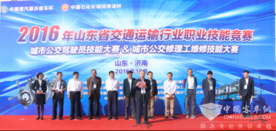 本次竞赛由山东总工会、山东省人力资源和社会保障厅、山东省交通运输厅主办,山东省交通工会、山东省城市公共交通协会、山东省城市公交企业工会联席委员会承办,济南市公共交通总公司、济南交通技师学院、中国重汽集团济南豪沃客车有限公司、中国石化润滑油有限公司山东销售分公司共同协办。参加启动仪式的领导有:中国海员建设工会全国委员会委员张杰、山东省总工会经费审查委员会主任蒋石宝、山东省交通工会主席姜述奎、山东省交通工会调研员孟广琳、济南市交通运输局副巡视员袁谊波、山东省城市公共交通协会理事长薛兴海、德州公交总经理马军等十七地市的20余家公交公司负责人,中国重汽集团公司党委副书记、副总经理于有德在启动仪式上发表致辞。中国重汽执行董事刘培民、中国重汽豪沃客车销售部总经理马锡洪参加活动。