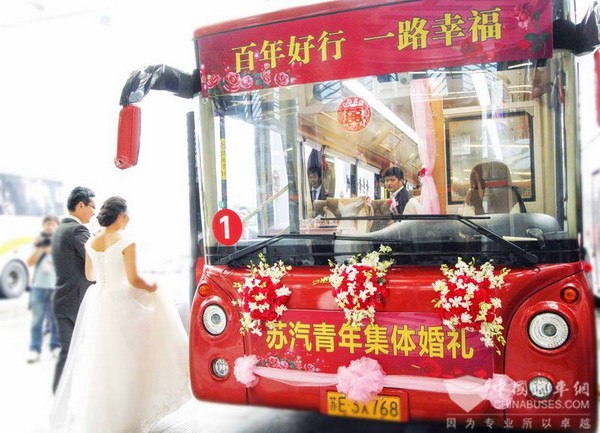 2016年10月22日,苏州客运西站,一辆“苏州好行”海格巴士在鲜花彩带装扮下显得格外喜庆醒目,这是苏汽集团为苏汽青年集体婚礼精心准备的幸福专车。幸福专车前方,“百年好行,一路幸福”标语,寄托着苏汽集团对交通新人们的真挚祝福。