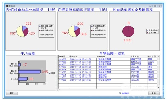 为了保障纯电动客车安全运行,杭州公交集团采用互联网+的手段,构建了新能源车后台管理系统,该系统实现了安全故障及时报警和相关数据有效上传的功能,覆盖了三个修理公司全部1500辆BYD纯电动车。