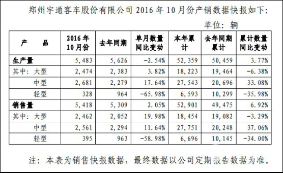 宇通2016年前10月产销数据简评 销量同比增幅6.92%