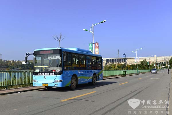 行驶在丹江口水库大坝前的厦门金旅纯电动公交车