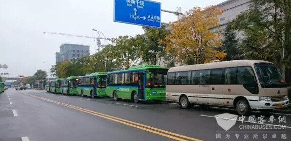 2016年11月17日上午,14辆扬子江纯电动客车排列整齐,在区党校大门整装待发。它们光荣的担负了中国共产党东西湖区第十一次代表大会会务服务专车任务,为参会党代表提供服务。