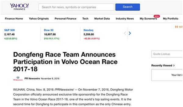 据美联社资料显示,目前已有274家国外媒体对此事进行了报道,包括美国、德国、英国、新加坡、加拿大等各个国家的媒体。其中,美国著名的互联网门户网站Yahoo!的报道文章为《Dongfeng Race Team Announces Participation in Volvo Ocean Race 2017-18》文章,阅读量高达将近20万人次。而全球多达25家全球顶级媒体,如Chase、Yahoo! Canada、Beauty, Fitness and Me、Yahoo! Singapore、ADVFN Germany、National Post等更对东风队参加沃尔沃环球帆船赛进行了大篇幅重点报道。
