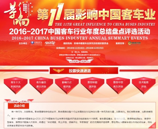 此次活动的评选主要通过网上读者调查评选的方式进行,以“影响中国客车业”为主题,内容包括:“2016年度客车行业十大新闻评选”、“2016年度客车最佳雇主评选”、“2016年度影响力之星评选”、“2017年度推荐新能源评选”和“2017年度推荐中型客车评选”和“2016年度客车配套产品评选”。