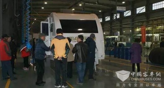 客人在公司副总经理张伟华的陪同下,参观了总装车间生产线,了解安源客车生产制作流程和工艺。