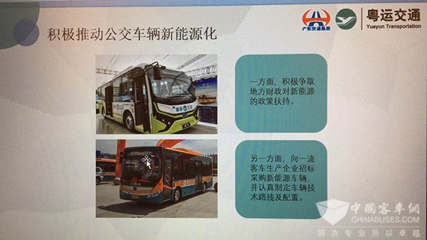 第一,积极推动公交车辆新能源化。新能源公交车已经从市场导入期进入快速成长期,按照广东省关于加快新能源汽车推广应用的实施意见,全省新能源公交车保有量占全部公交车比例超75%,其中纯电动公交车占比超65%的相关规定要求,粤运交通积极推行公司公交车辆新增、更新新能源化。一方面积极争取地方财政对新能源的政策扶持,另一方面严格按照公司“五统一”的要求,向一流客车生产企业招标采购新能源车辆,并认真制定车辆技术路线及配置,确保甄选出可靠、适用的新能源车辆,并根据车辆运营计划,做好车线匹配和电量测算的技术把关,同时延长“三电”(电池、电机、电控)特别是动力电池部分的三包期,锁定使用寿命,并适当加大动力电池配载量,降低车辆寿命过短的风险。目前,所属佛山粤运公交、佛山三水粤运、阳江、河源、韶关、汕尾、潮州等公司至2016年底,投放的新能源车辆总数将达到1743辆左右。