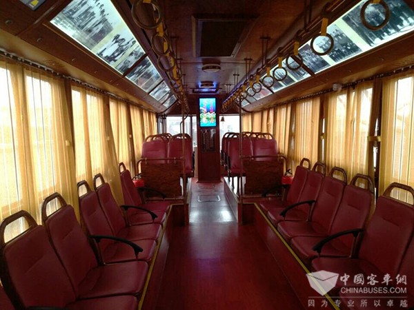在保定公交停车场,记者看到了铛铛车,该车身长12米,车体门窗为木纹条理,头尾中央部位各装有一个火车头大灯,古香古色。驾驶员身穿红色上衣,衣领、衣襟、袖口均镶有金色仿古图案,下身穿蓝黑色长裤,头戴深蓝色礼帽,整体呈现复古风情,为乘客营造了一场接近真实的穿越之旅。