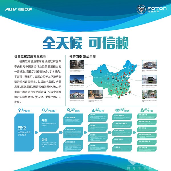 在交通运输行业品质升级的驱使下,能够同时抓住客户眼球的一定是品质优良、服务完善、价值观凸显的"全天候可信赖"的品质客车。福田欧辉针对客户需求升级,把脉行业发展动向,率先提出"全天候可信赖"的概念,成为行业首家提出品质客车评价体系的企业。据福田汽车品牌策划总监、福田欧辉客车品牌总监韩鹏介绍,"全天候可信赖"是福田欧辉品质客车标准的一套评价体系,囊括了对行业协会、学术研究、零部件、整车厂、客运公司等上下游产业链的相关评价标准,包括1个定位、2大目标、3D制造、4A品质、5S服务、6V价值。