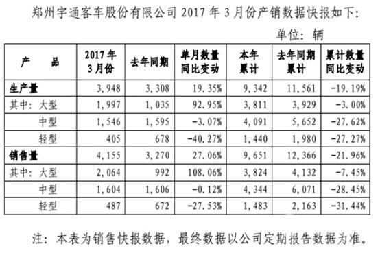 宇通3月份产销增幅回稳 大客销量同比增长108.06%