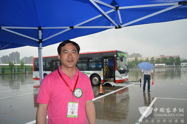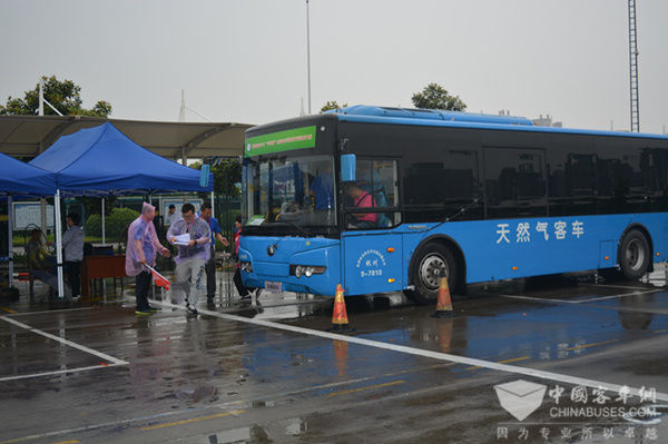 12日的杭州细雨如织,比赛继续进行,风雨无阻,据现场一位裁判长,来自上海巴士三公司机务部副总经理谢晓东表示,公交运营从来都是风雨无阻,下雨天更能比出公交驾驶员的水平,但天气不会影响到比赛的公平性,因为同一车型的选手是在同一天比赛,保证比赛外部环境的相同。