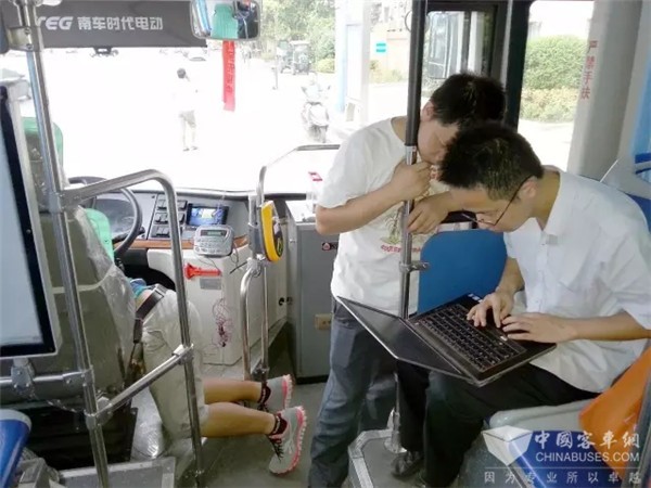跟车试验在株洲55路公交线上进行,每天清晨天空刚泛起鱼肚白,团队成员们就聚集在了清石广场公交基地,赶在公交发车之前安装调试试验设备,完成产品运行状态检查。随着早上5点45分第一班55路公交车发出,紧张的跟车测试便开始了。