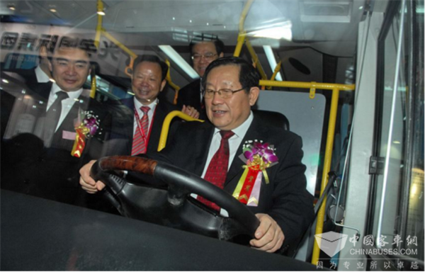 资料图片:2008年4月,科技部部长万钢在深圳试驾五洲龙混合动力客车