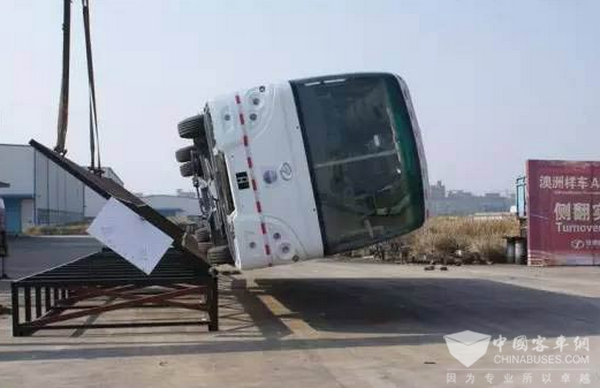 试验结果表明,安源出口澳州样车在与地面倾斜36°时才翻转落地,这比国际客车侧翻试验标准倾斜临界角度35°还多一度。侧翻试验倾斜角度大,表明客车的重心低,在高速行驶过程中稳定性好,车辆出现事故的可能性会大大减小。车辆从试验架上翻转落地后,除前窗玻璃、侧窗玻璃破损外,车身骨架没有变形,客车内部空间没有出现任何挤压现象,客车的各部件完好无损,再次印证了安源客车高强度的车身品质。
