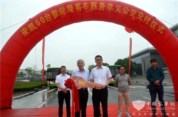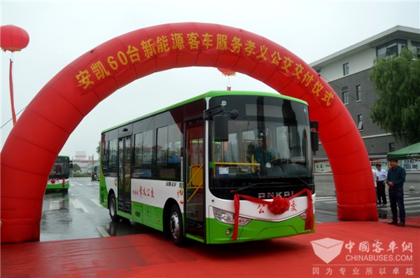 孝义市交通局冀局长在交车仪式上表示:去年,孝义公交公司采购了50台安凯纯电动公交,在一年的运行过程中,了解到安凯客车质量过硬、售后服务跟进及时。特别是在孝义市创建全国文明城市过程中,安凯纯电动公交作为城市中一道亮丽的风景线,作出了不可替代的贡献。相信此次60台安凯纯电动公交车会让孝义市民再一次感受到新能源公交的绿色、环保和视觉享受!祝愿安凯客车与孝义公交公司携手参与到中国梦、绿色梦的大潮流中,一起引领时代变革,创造更加美好的绿色生活!