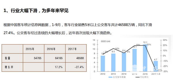 1、2017年行业大幅下滑,为多年来罕见。根据中国客车统计信息网数据,1-9月,客车行业销售5米以上公交客车共计46588万辆,同比下滑27.4%。公交客车经过连续的大幅增长后,近年首次出现大幅下滑趋势。
