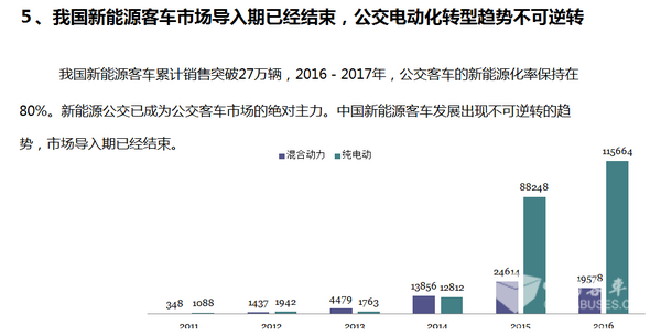 5、我国新能源客车市场导入期已经结束,公交电动化转型趋势不可逆转。我国新能源客车累计销售突破27万辆,2016-2017年,公交客车的新能源化率保持在80%。新能源公交已成为公交客车市场的绝对主力。中国新能源客车发展出现不可逆转的趋势,市场导入期已经结束。