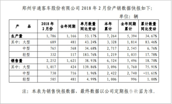 轻客方面,2018年2月份呈现产销双升态势,2月份宇通生产轻客332辆,销售轻客505辆,相较2017年同期分别有着183.76%和4.99%的增幅;2018年1-2月宇通共生产轻客1219辆,销售轻客1006辆,分别实现了17.78%和1%的增幅,一举扭转了从去年下半年延续至今的轻客产销疲软的态势。