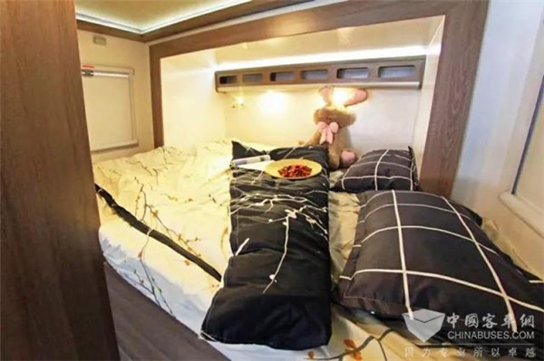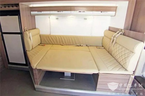 客厅加装拓展机制,可向车身右侧凸出,增大客厅活动空间。半包围式沙发采用皮革包裹,质感柔软,沙发中央配有可升降桌,白天作为餐桌,晚上休息时,降下餐桌,即可与周围的沙发合成一张2200mm*1100mm的床位,用途多样,且配有190L的多美达双开门冰箱、拉式酒柜以及顶置空调,环境更加温馨、舒适。