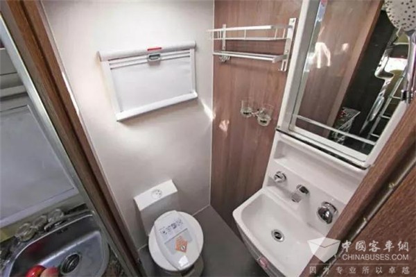 卫生间位于厨房后面,里面装有电动换气扇、毛巾架、一体式淋浴系统以及多美达盒式马桶等齐全配置,加上200L的净水桶、50L的热水箱,完全满足车内6人的洗浴问题。