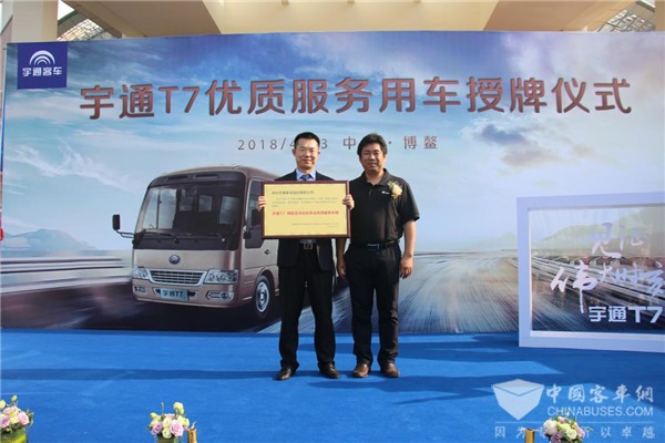 2018年4月13日,宇通T7优质服务用车授牌仪式在海南博鳌隆重举行,海南省外事侨务办公室向宇通T7授予了“博鳌亚洲论坛年会优质服务车辆”称号。起迎八方宾客,坐论四海风云,宇通T7以实力诠释自主品牌公商务车品质担当。