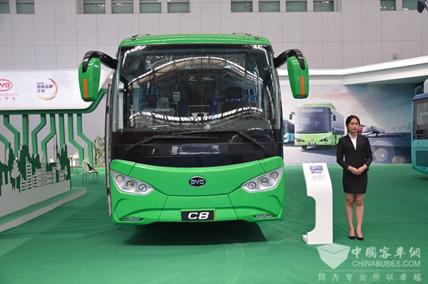 比亚迪C8纯电动客车是道路客运领域备受瞩目的精品车型,可适用于旅游公司、公交公司、租赁公司以及公务用车等不同市场。在外观上,C8前脸轮廓鲜明,车身线条流畅,采用两门气动外摆的设计,整体给人以简约大方的视觉感受;在内部空间上,C8尽显“以人为本”的设计理念,宽大的车体和座椅的合理布局让乘客可享受宽阔的肢体伸展空间。整车融合了比亚迪三电核心技术外,还搭载再生制动系统、电控空气悬架系统、智能钥匙系统、盘式制动等领先配置。为进一步提升产品品质,C8还搭载了行业首创的动力电池热管理系统,具有耐高寒、耐高温、长寿命、高安全、易维护、适用广等特点。
