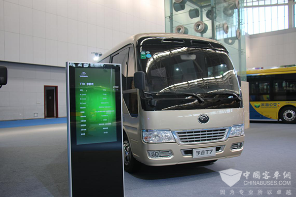 在三台公交车旁停靠的香槟色T7D高端公商务车柴油版同样带着一股与生俱来的高贵气质,吸引了众多参展者频频驻足。就在4月初,宇通T7汽油版车型刚刚圆满完成了服务博鳌亚洲论坛2018年年会的重任,这是宇通T7连续第三年承担博鳌论坛会场通勤服务工作。