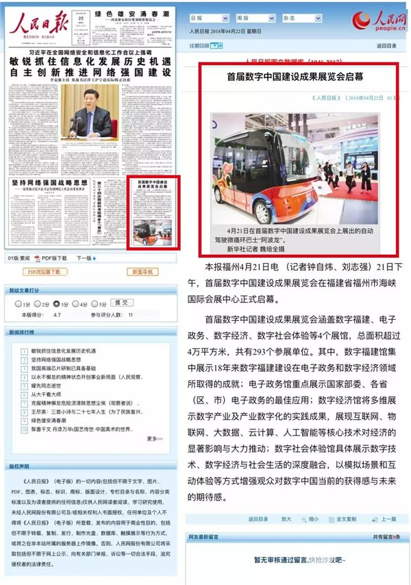 在刚刚落幕的首届数字中国建设峰会上,金龙阿波龙亮相数字中国建设成果展览会,并首次开放公众试乘,同时这也是中国无人驾驶车辆首次面向公众试乘,吸引了万千关注,继登上央视中国新闻专题报道后,又喜登人民日报头版。