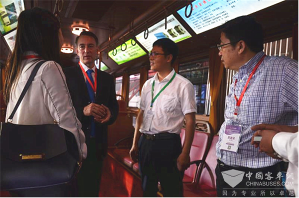 此次展出的18米中国红纯电动BRT公交车,正是去年10月在北京长安街大1路投入运行的明星车型。车辆外观采用富有时代感的仿生海豚造型,大流线设计可有效减小风阻,整车采用轻量化设计,控制系统高度集成,在保证结构强度的前提下,可有效节能降耗。车内采用低地板、大容量、宽通道的车辆结构设计,空间更大更舒适,满载可容纳160人。配合翻转轮椅导板及车内多功能区,实现了无障碍通行。