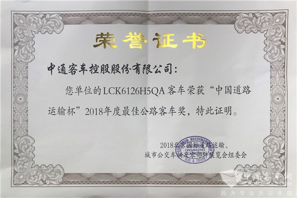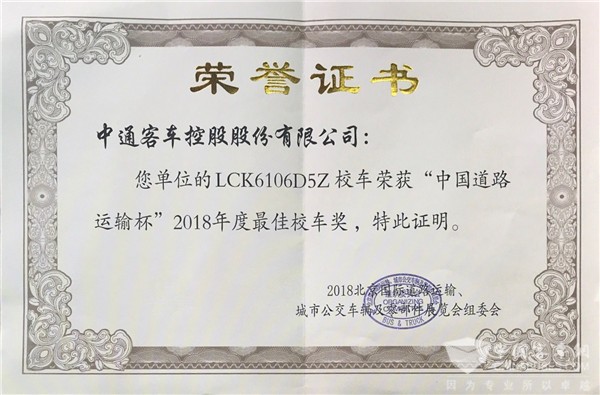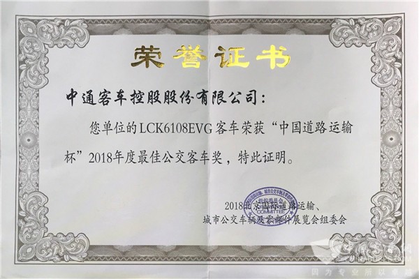 2018年5月28日,北京京林大厦,2018北京国际道路运输车辆展颁奖晚宴隆重举行。中通客车代表接连上台,依次从颁奖嘉宾手中捧过中国道路运输杯“最佳公路客车奖”、“最佳公交客车奖” “最佳校车奖”的奖杯与奖状,台下热烈响起的热烈掌声体现了该奖项的来之不易。