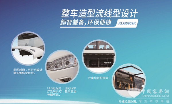 前脸的造型依旧保持了海格的家族式设计风格,中间盾牌造型镀铬装饰条上印着海格的英文HIGER,上面则是海格的车标。大灯采用了组合式设计,远近光、转向灯和日间行车灯均使用了LED灯组,提高了使用寿命,也遵循了当代倡导的绿色环保发展理念。下方的车身包围也设计的十分有特色,可以向上翻起,提高了车辆的维修便捷性。