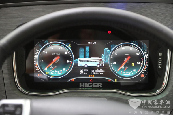 仪表盘摒弃了传统的指针表式设计,取而代之的是相当先进的全LED液晶仪表盘。仪表盘包括了发动机转速、时速、油量、水温、制动气压表以及中间的车况表,如果要通过一个LED液晶显示器显示这么多东西首先就需要CAN总线技术的支持,CAN总线将各个检测元件的数据实时反馈到显示器上。所以说这套设计不单纯是美观,还可以从中感受到当代客车已经迈入了智能化时代,而海格全系列客车都已匹配其自主研发的CAN总线。
