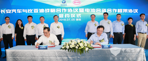 2018年7月5日,长安汽车与比亚迪在深圳签署战略合作协议,且将联合设立以新能源动力电池生产、销售为主营业务的合资公司。双方将联合各自在传统汽车、新能源汽车、智能互联网、共享出行、海外市场等领域的优势资源,围绕汽车电动化、智能化、共享出行等领域展开全方位深度合作,实现优势互补、互利共赢,合力推动中国汽车工业发展,并为广大消费者带来更加绿色、智能的出行体验和服务。