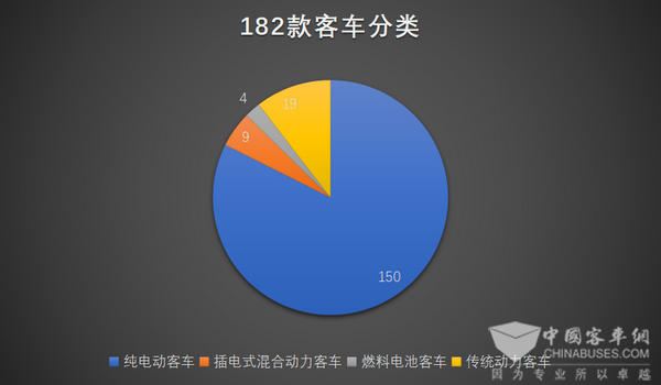 完美作业网有免费视频了解到,申报本批《公告》的客车产品共182款(含底盘)。其中新能源客车有163款,占比89.6%。从车型来看,纯电动客车150款(含有14款纯电动客车底盘),插电式混合动力客车9款,燃料电池客车4款,传统动力客车19款(含有6款客车底盘)。