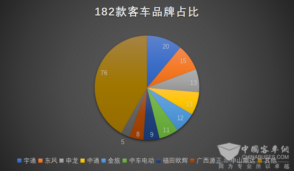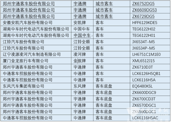 本批申报的19款传统动力客车,宇通牌最多,有8款产品(含4款客车底盘);中通客车3款,江铃汽车2款,中车电动2款,安凯、金旅、东风、凌河汽车分别1款。