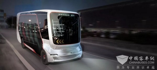 入口车门位于车辆侧边中心,需要的时候车门可以作为一个大的显示屏,特点非常明显。车上有一个交互区,可以让乘客与车辆进行交互。位于车辆的后部出口车门从外部看显得不是那么重要,因此,特意进行了一些限制。