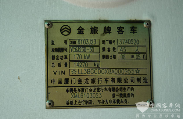 铭牌记录金旅XML6103J23的10年发展历程