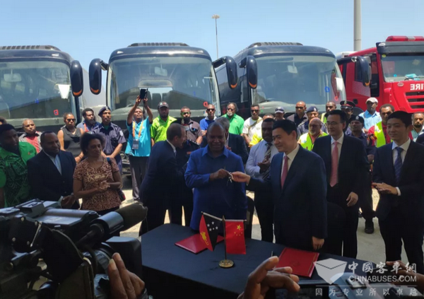 2018年10月10日上午,中国援助巴布亚新几内亚(简称“巴新”)车辆交接仪式在巴新首都莫尔斯比港举行,中国驻巴新大使薛冰出席仪式并同巴新计划部长马鲁签署交接证书。当天,带着中国人民的友谊,94辆中方援助车辆,包括85辆金龙客车公交与团体客车正式交付巴新方。