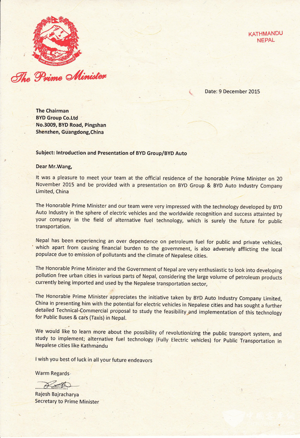 早在2015年12月,奥利总理指示总理府团队给比亚迪董事长兼总裁王传福写信,希望比亚迪把电动车带到尼泊尔。信中写道,“发展可替代能源是未来公共交通的方向。在此领域,比亚迪新能源汽车科技及其在世界范围内所获得的赞誉和成绩,给总理先生留下了深刻的印象。总理先生和尼泊尔政府对发展尼泊尔各地的无污染城市建设充满了热情。总理先生很感谢比亚迪提出的电动车解决方案,中国目前的电动车发展让他对尼泊尔发展电动车充满信心。我们想更多地了解改革公共交通系统的可能性,并研究在加德满都等城市的公共交通系统实施可替代燃料技术(纯电动汽车)方案。”