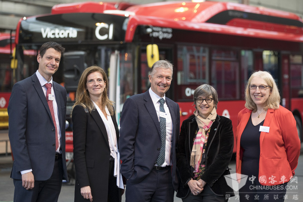 从左到右:伦敦交通局负责地面交通的总经理Gareth Powell、 RATP Dev首席执行官Laurence Batlle、伦敦交通局总裁Mike Brown、RATP集团董事长兼首席执行官Catherine Guillouard、RATP Dev伦敦分公司总经理Fiona Taylor