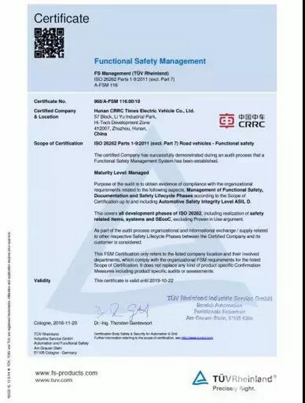 此次管理体系认证的通过,是对中车电动在符合功能安全的流程体系建设上的认可。在国际化发展道路上,中车电动有信心攻克难关,开发出更多与国际接轨的产品和通过更多国际顶尖标准,为全球市场开拓,打下坚实基础。