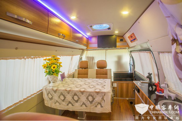 车辆采用 1.2mm超厚专业钢板的应用,配合自主的车身设计,使整车更加坚固、安全。金旅 XML5036XLJ15旅居车内高1.60米,前部右侧是24寸液晶电视;后部右侧是半固定式一体卫生间;中间上方安置前后分区冷暖空调,对坐沙发可变为双人床,满足2-3人的休息,旁边是多功能小吧台,上有洗菜池和电磁炉;车尾有储物格(外置灶台)、30L热水器、外拉式水龙头和车外照明灯。