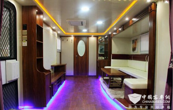 暗红色的饰板和地板配以黑色的皮质座椅,让整个车内的氛围变得高档起来;打开室内全部灯光,给人的感觉像是星级酒店。360°可旋转座椅搭配办公台面,办公可以照常;工作之余吧台来一杯红酒体验美好生活,纵置沙发组合加上对坐沙发,不管是会客还是开个party都绰绰有余。